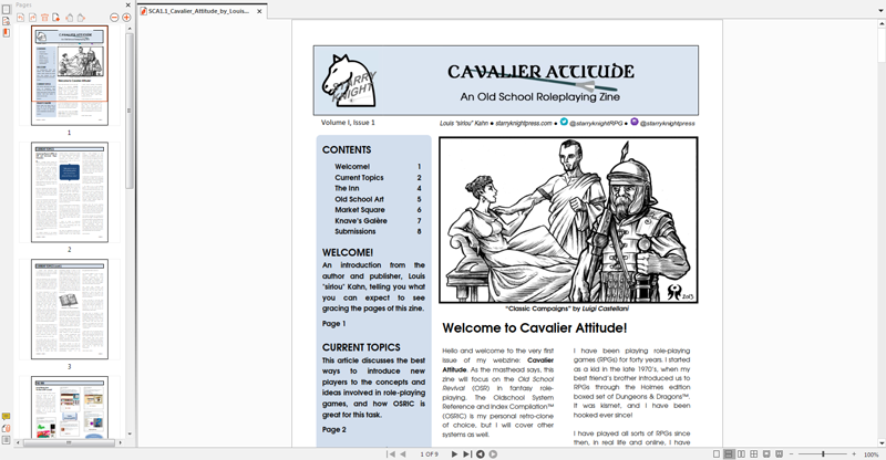 I'm proud to introduce my ninth product, my new zine: Cavalier Attitude! As the masthead says, this zine will focus on the Old School Revival (OSR) in fantasy role-playing. The Oldschool System Reference and Index Compilation™ (OSRIC) is my personal retro-clone of choice, but I will cover other games systems as well, as interest and time permit. However, the materials will be relevant to BECMI, 1E and 2E players as well as those who play the modern (5E) game.