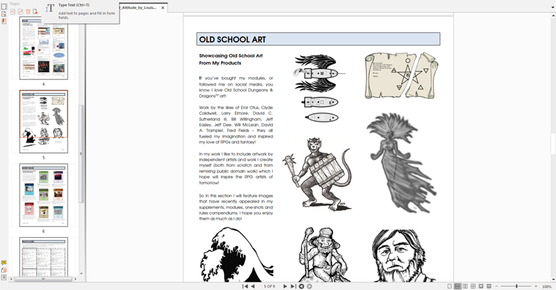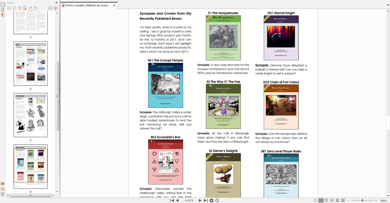 As you will see from the preview’s table of contents, the zine will feature articles on gaming subjects of interest to Old School players and those who play the newer editions; Old School art by myself and other artists featured in my work; updates on my modules, supplements and campaign world; a social media round-up; and each issue we feature a well balanced party of six pre-generated characters for use by you and your players as NPSs or player characters in your own campaign.