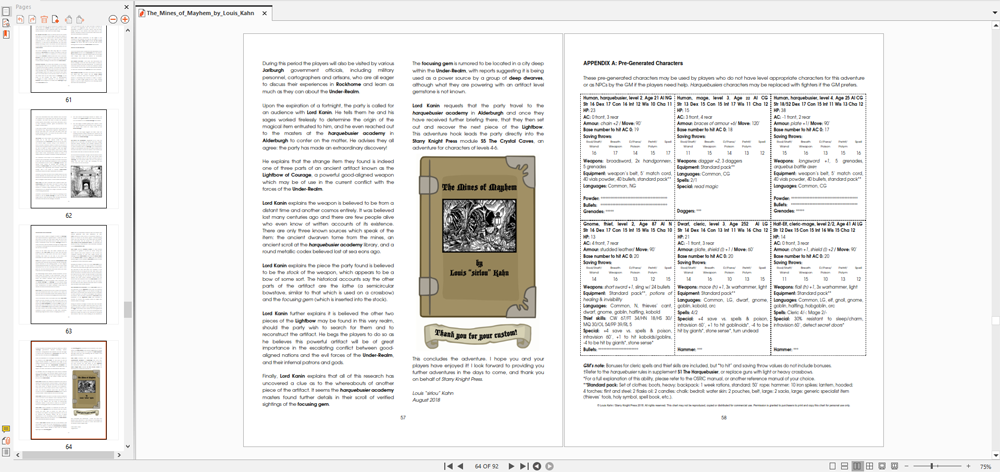 6 (six) characters for immediate use by players or the GM. Each of the characters is presented completely ready to play with all of the necessary stats and gear, including the magic items appropriate to their level. As an added bonus these characters are specially laid out so the GM can simply print out the page, cut out the sheets, and hand each player their own mini character sheet, and the group is ready to play!