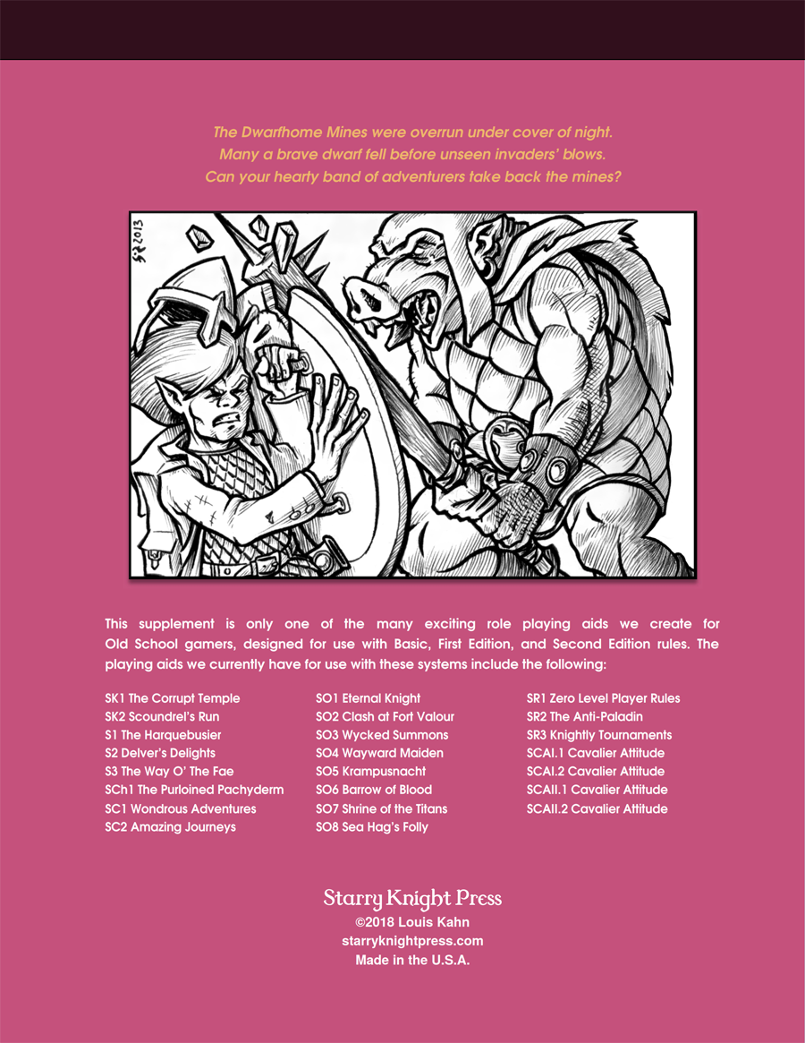 In The Mines of Mayhem your players are going to be tasked with discovering what tragedy has transpired at the DWARFHOME MINES, where unknown marauders have attacked the miners, and shut down mine operations. The dwarves recently dug so deep they intruded into hidden UNDER-REALM city of ROCKHOME. While neither side was aware of the other, both prospered. Now, however, a war has begun and your party is thrust onto the front lines in the confrontation between the surface-dwelling forces of the Light and the Under-Realm forces of evil! Are they up to the challenge?
