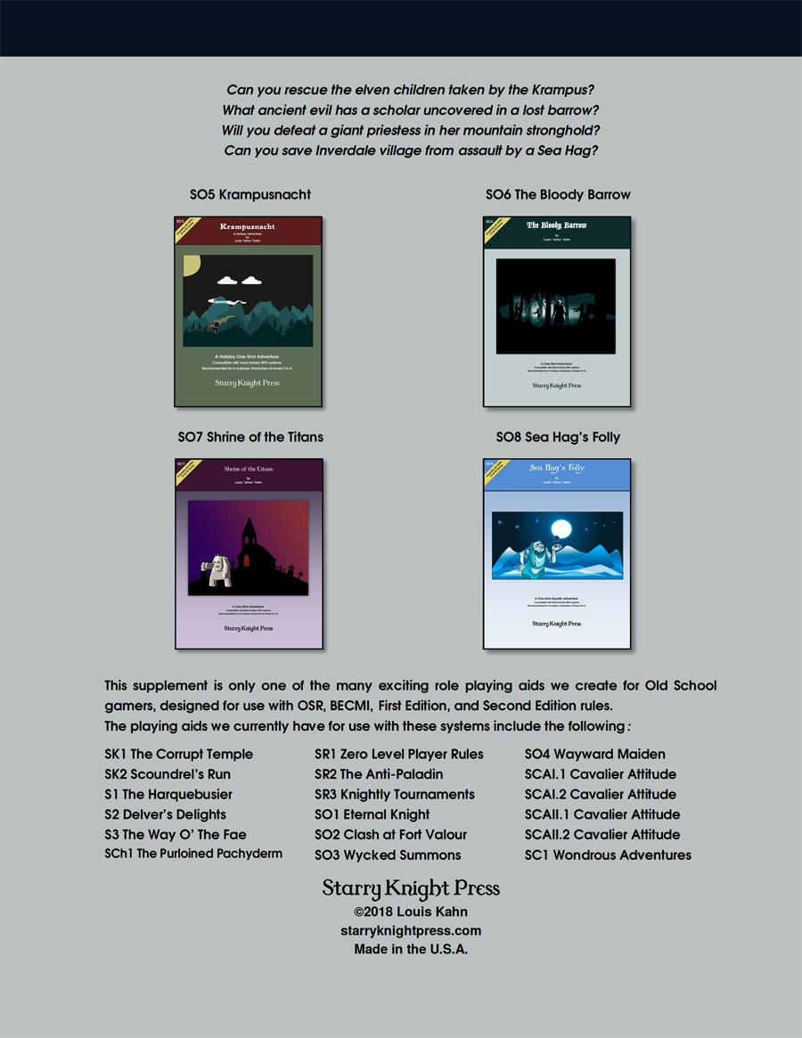 This supplement is a collection of FOUR ONE SHOT ADVENTURES which I have published, fully detailed and ready for immediate use with very little preparation by the GM or the players! Many glorious nights of role-playing fun are right at your fingertips!
