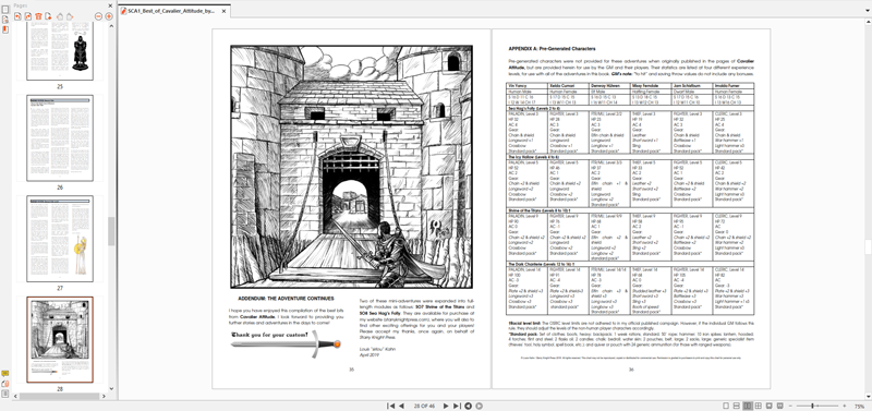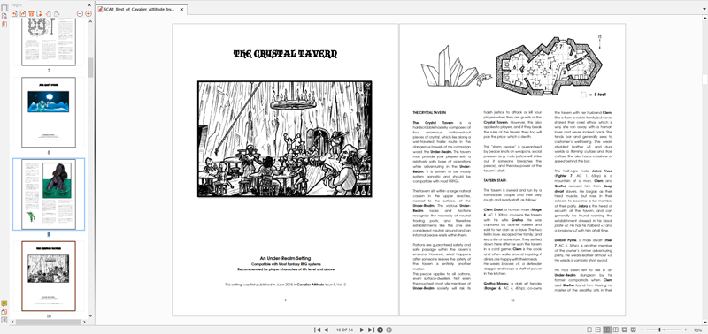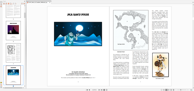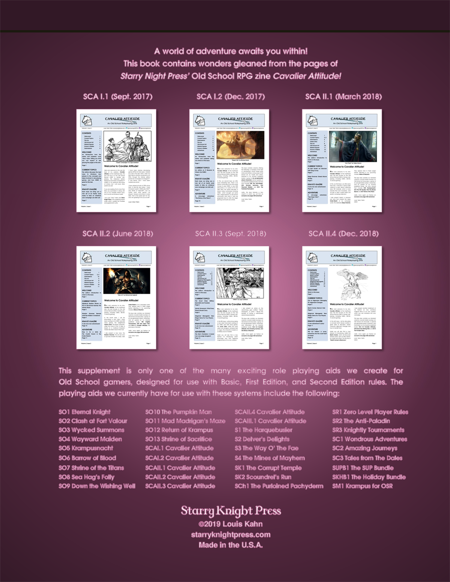 This supplement was inspired by the venerable TSR “Best of Dragon” series. In this supplement you will find adventures, RPG articles, and fantasy fiction all gleaned from the first two years (Volumes I and II) of my Old School zine, CAVALIER ATTITUDE! 56 pages of OSR goodness featuring adventures scenarios, RPG articles, short fantasy fiction, and much more!