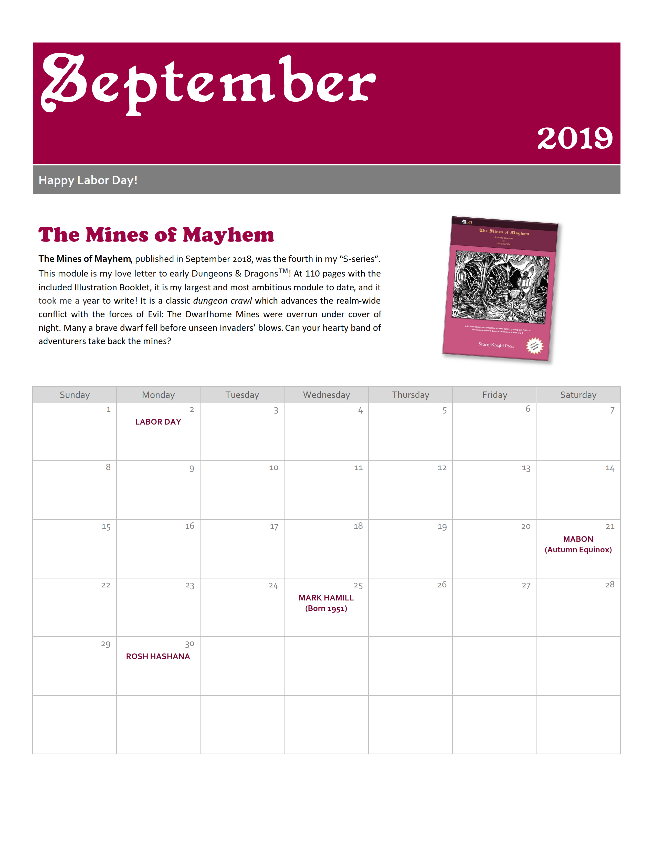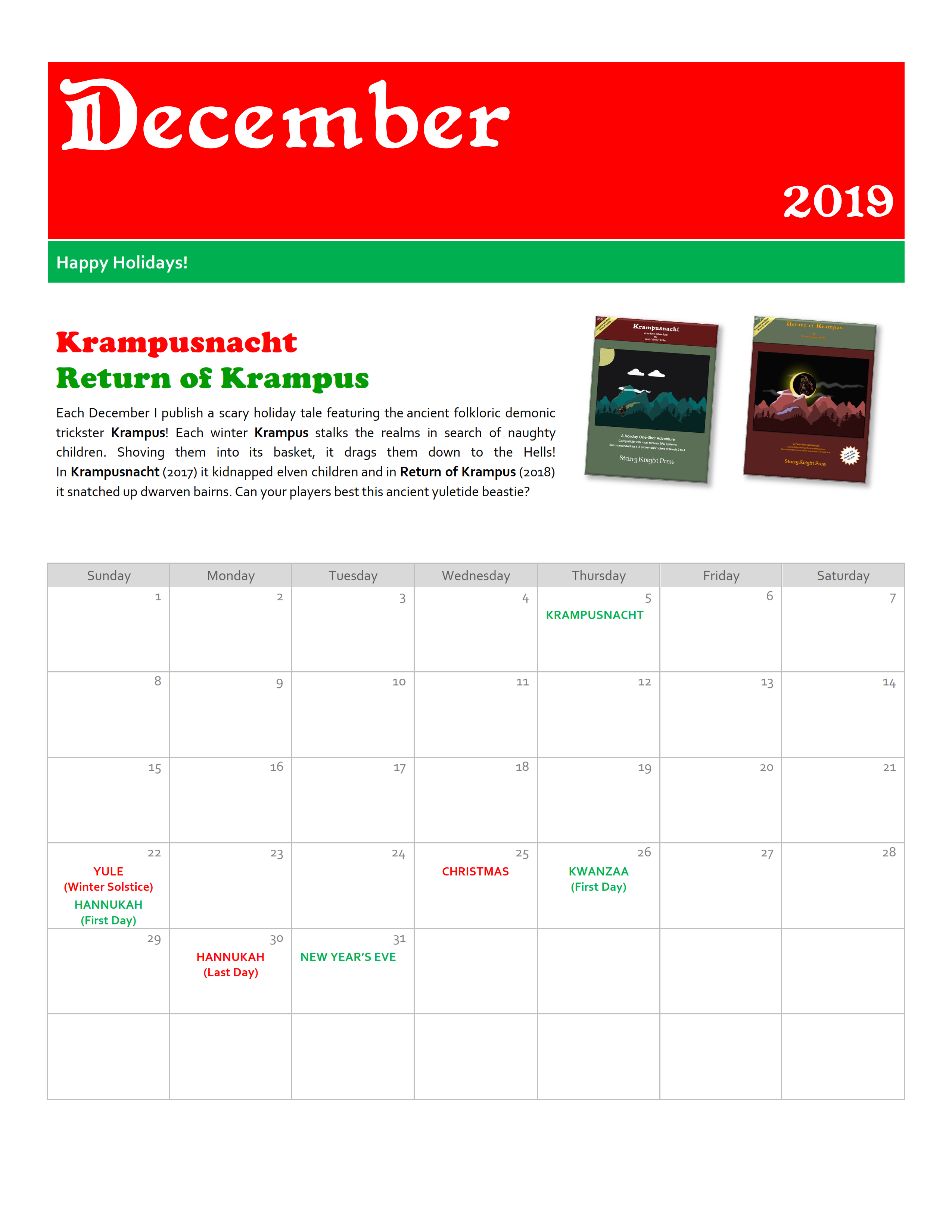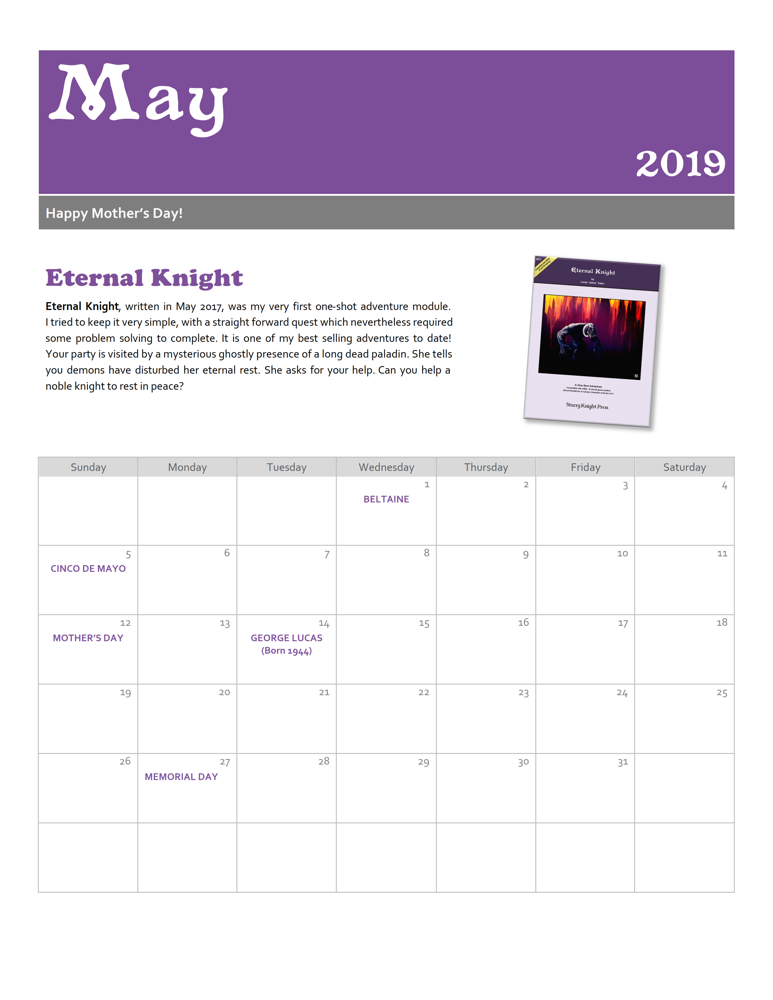 This 12 Month calendar features a different Starry Knight Press supplement each month, coinciding with the month the supplement was written and/or released. The calendar also contains the United States Federal Holidays, as well as the major religious holidays for several faiths including the Old Faith, which is a key religion the faiths in my published campaign are based on. It also includes the birthdays of authors, creators and artists who are important and influential to me and many others in the RPG and fantasy community (e.g. Gary Gygax, J.R.R. Tolkien, J.K. Rowling, and etc.).
