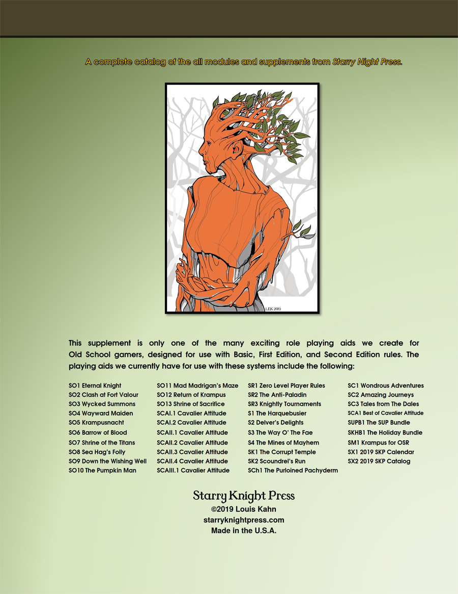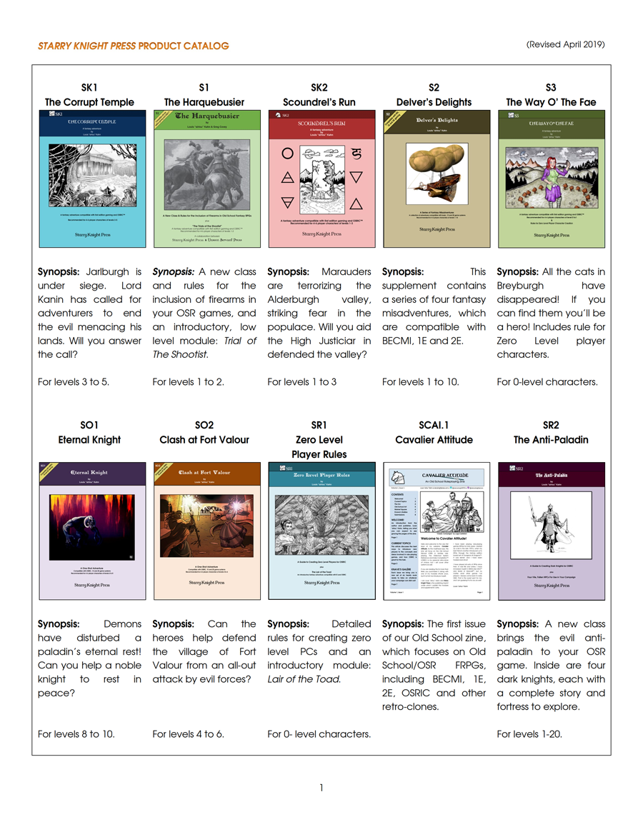 The Starry Knight Press 2019 Catalog features our entire selection of currently available books and supplements, information on upcoming titles, and a map of the currently discovered portion of my campaign world of Terrans, all depicted in full color. This supplement chronologically covers every book from our last three years of publishing: from our first module (SK1 The Corrupt Temple, published Jan 2017) to our most recent release (SCA1 The Best of Cavalier Attitude, published April 2019).