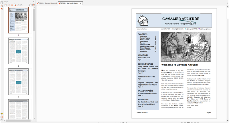 Welcome to the First issue of the Third Volume of my webzine: Cavalier Attitude. As the masthead says, this zine will focus on the Old School Revival (OSR) in fantasy role-playing. The Oldschool System Reference and Index Compilation™ (OSRIC) is my personal retro-clone of choice, but I will cover other games systems as well, as interest and time permit. The zine is publishing quarterly. The first issue was published in September 2017, this is our seventh issue.