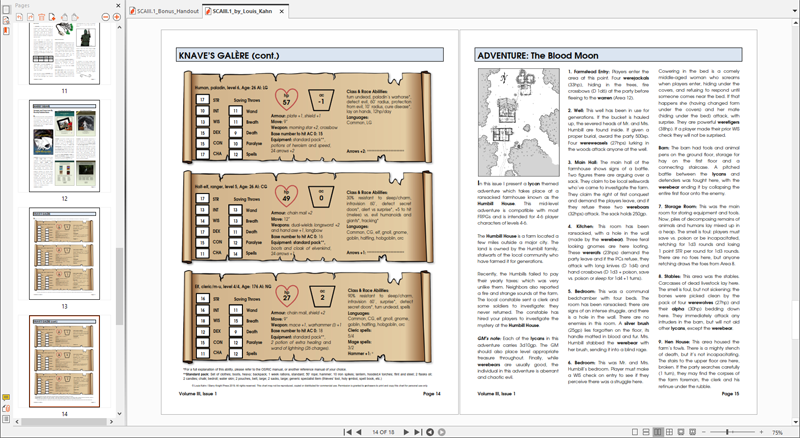 The seventh issue’s contents include the following: an article on applying legal system in your fantasy role playing campaign, entitled "Felony Murder Hobos"; Bard’s Corner: a new short story is featured in this issue, entitled “Prue's Fate"; an exclusive OSR adventure "Blood Moon": a lycan-themed adventure which takes place at a ransacked farmstead, for 4-6 player characters of levels 4-6; along with our standard features (art from my modules, synopsis of my recent releases, pre-generated PCs/NPCs, new and unique magical items, and a social media round-up). A total of 19 pages with the BONUS HANDOUT for the Blood Moon adventure.