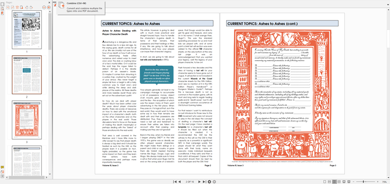 - Ashes to Ashes: Dealing with Player Character Death: an article discussing the sensitive issue of player character death from a practical standpoint; with a sample character last will and testament.