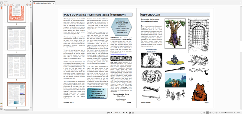 - Bard’s Corner: a feature showcasing fantasy fiction with an RPG theme, by myself and others. In this issue is the final half of a two-part story entitled “The Trouble Twins".
