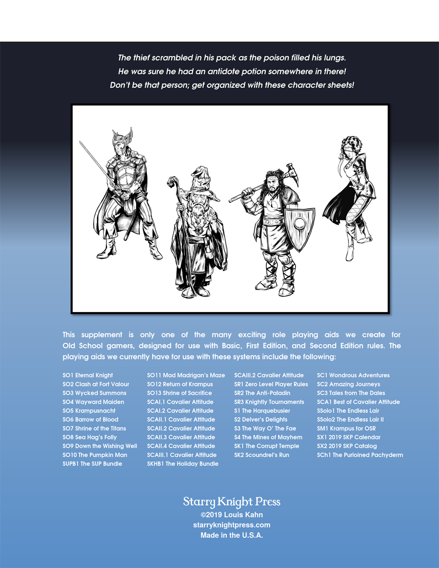 A second page (or back page if you print these as 2 sided as intended) of the character sheet is included, listing other important character information such as gear, encumbrance, experience points, treasure, magic items, and readied spells. An optional third page is included as a SPELLBOOOK for spellcasters, with slots for the caster's known spells, from levels 1 to 9. An optional fourth and final page provides a series of three STANDARD PACKS to choose from, to assist in getting your character up and running as soon as possible.