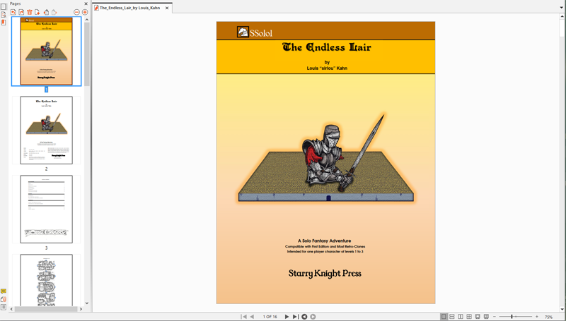 This 16 page book contains a BRAND NEW SOLO ADVENTURE for one player character of Levels 1-3. This module presents the player with deadly challenges and, true to Old School sensibilities, death will be the rule and not the exception in this maze. However, those brave souls who do survive can proudly claim they have bested The Endless Lair! You can play with any of the five pre-generated player characters provided, or your own character; and try and try again until you succeed!