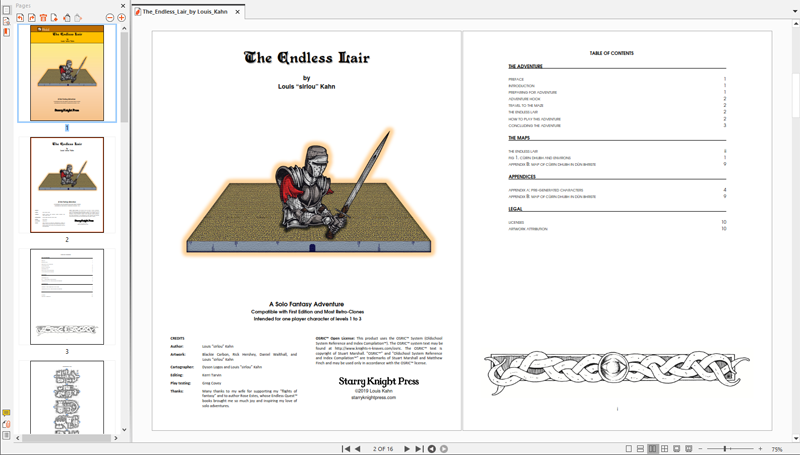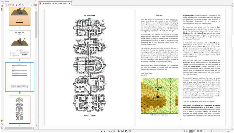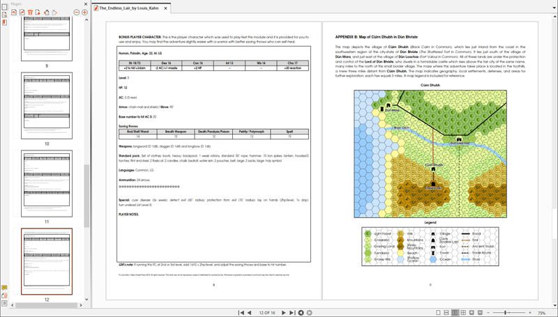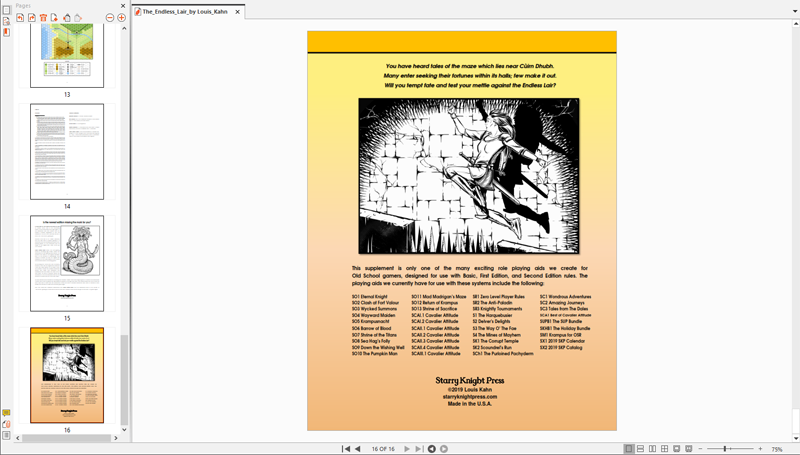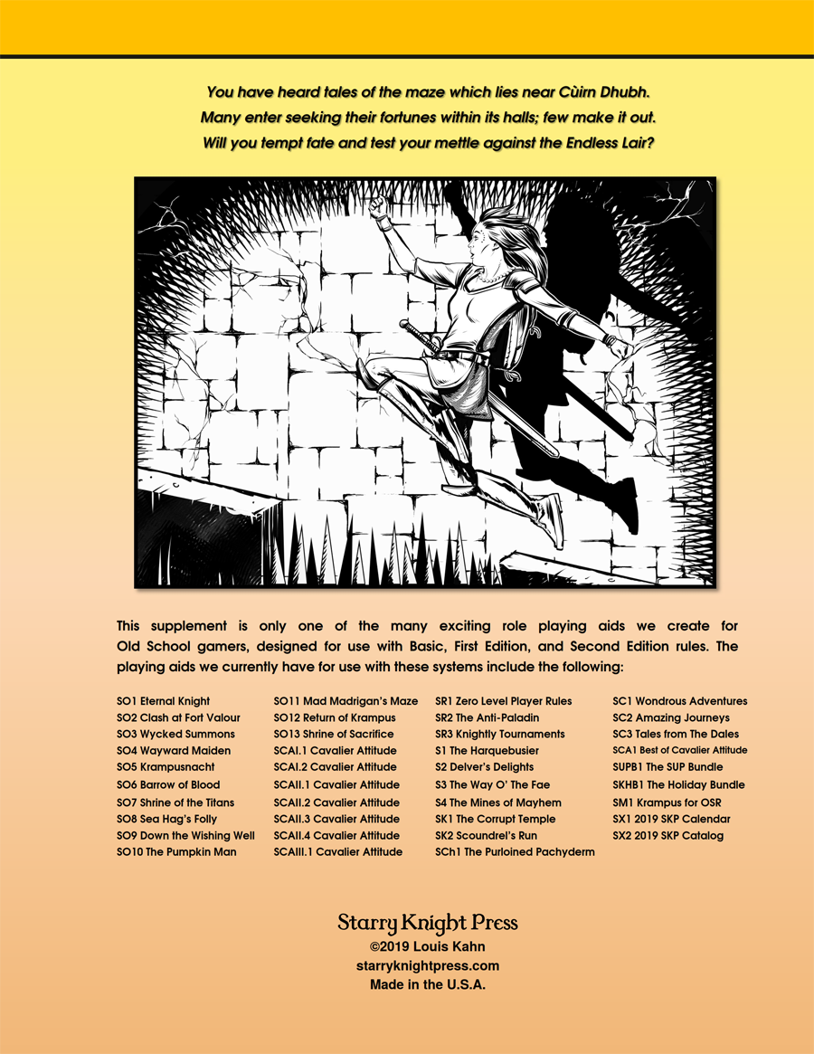 This module presents the player with deadly challenges and, true to Old School sensibilities, death will be the rule and not the exception in this maze. However, those brave souls who do survive can proudly claim they have bested The Endless Lair! You can play with any of the five pre-generated player characters provided, or your own character; and try and try again until you succeed!