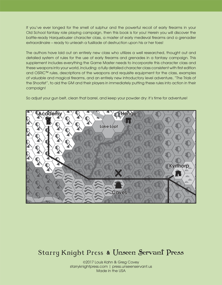A new player class for OSRIC™ and other OSR retro-clone games. If you’ve ever longed for the smell of sulphur and the powerful recoil of early firearms in your Old School fantasy role playing campaign, then this book is for you!