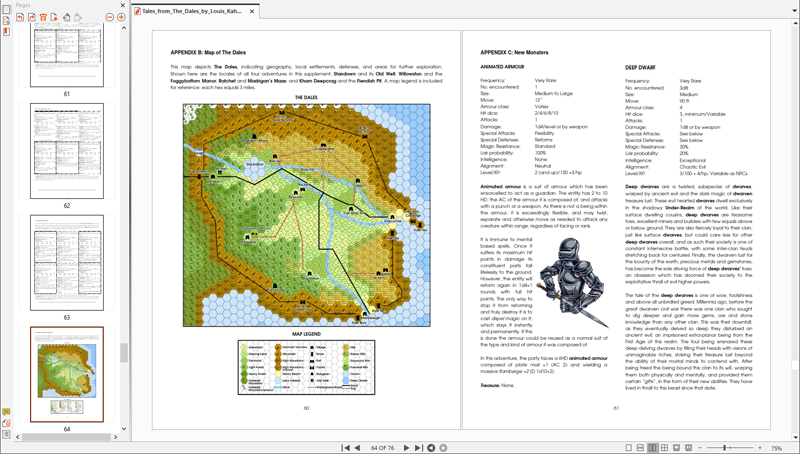 THE DALES, the ancestral home of the dwarves, gnomes and halflings in my world. In this 76-page tome you will find FOUR COMPLETE, exciting modules to challenge you and your players. Your group is going to be introduced to a variety of challenges, in a number of settings, requiring several different skill sets. There are battles for sure, but there are also puzzles, traps and thinking problems!