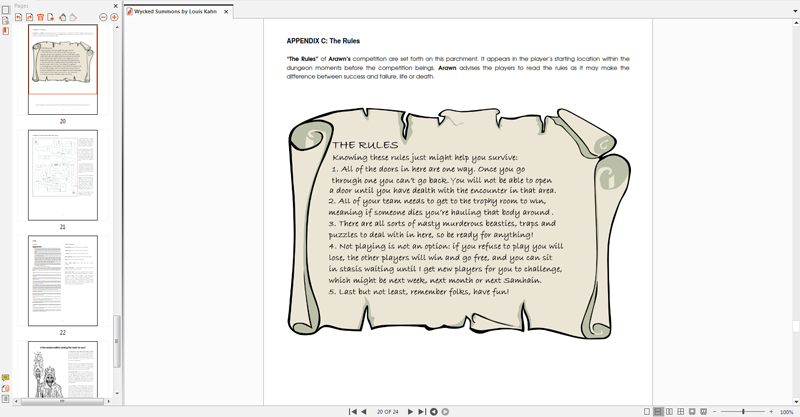 Wycked Summons is my eleventh book, my third one-shot adventure and my third book set within The Red Eagle Barony. It is based on the idea of a head-to-head competition between two adventuring parties, with detailed maps and encounter descriptions for both teams dungeon crawls! It takes place primarily on a pocket plane, so that GMs could easily drop it into their existing campaign world, for a quick and deadly gaming session with your players.