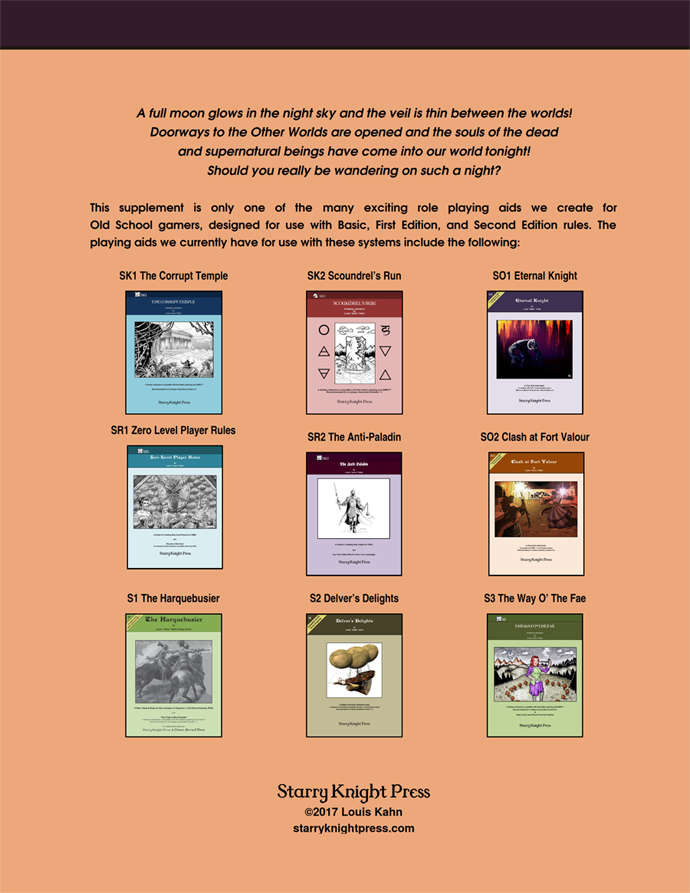 This module provides wonderful background information and additional areas for adventure for those GM’s setting their campaigns in the author’s ever expanding campaign world, which now comprises four different kingdoms: Jarlburgh, Alderburgh, The Red Eagle Barony, and Dún Loachas. This adventure’s exploration of the trickster god’s home takes place just west of Inara Marteen’s barrow mound, the site of the Starry Knight Press module SO1 Eternal Knight, and it takes place just east of the village of Breyburgh, the site of the Starry Knight Press module S3 The Way O’ The Fae (both of which are currently available for sale here).